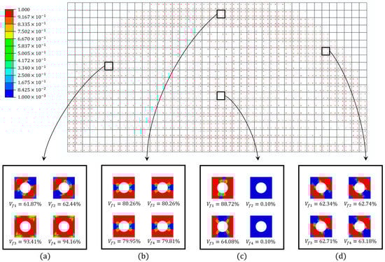 The contour plot of densities after optimization is shown in Figure 6. To better show the results, only the elements with the top of the density are drawn in the whole model picture. Four typical macroscale elements are zoomed in and plotted at the bottom of the whole model picture. The , , , and in the figure represent the retained volume fraction of each RVE.