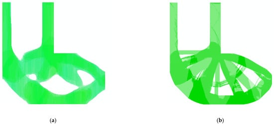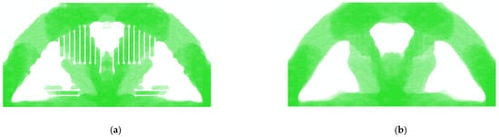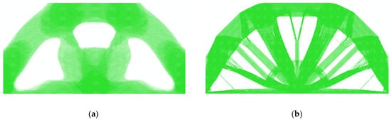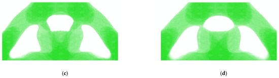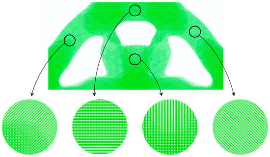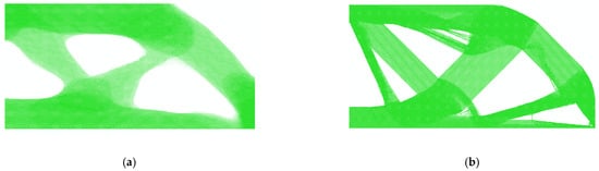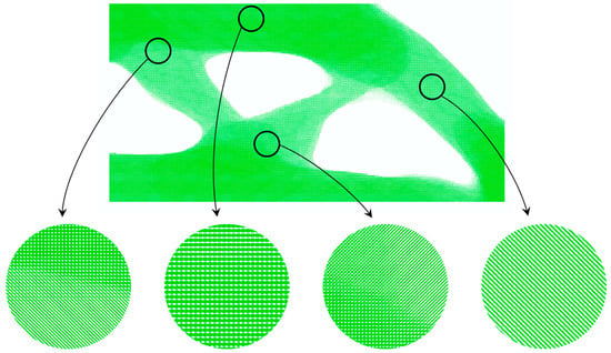 It can be seen that the volume fractions of each RVE are different from one other in Figure 6. Therefore, the Direct FE2 has more freedom in the local optimization and is more flexible than other concurrent topology optimization methods [30]. However, due to the minimum density being set to to prevent the model from a singularity, the RVEs with volume fraction of should be removed totally according to the optimization result. This will lead to the checkerboard problem or “gap” problem, which will be shown in the following explanation. Therefore, the density filter in Section 3 is necessary. The density filter will “fill in” the “gap” and the reconstruction result are shown in Figure 7. Some local details of the reconstructed Bridge-type model are also plotted, and it can be seen that the local details are consistent with the force flow of the structure.