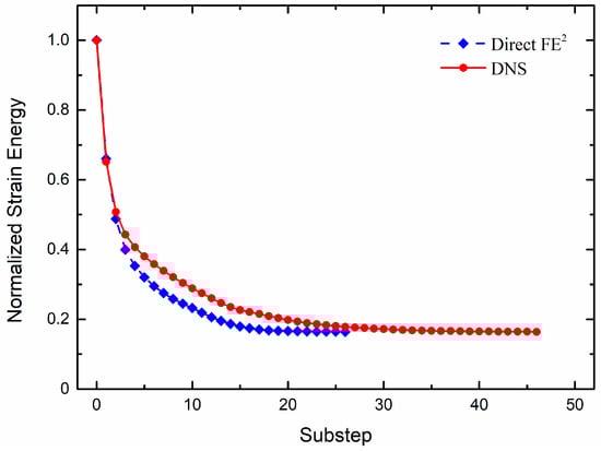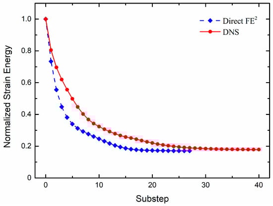 The strain energy in the iterative process of the Direct FE2 model and the DNS model is shown in Figure 8. The target volume fraction of the Direct FE2 model and the DNS model for the topology optimization is . The strain energy of the Direct FE2 model and the DNS model before optimization is and , respectively. After optimization, the strain energy of the Direct FE2 model and the DNS model becomes and , respectively. Due to the initial strain energies of the Direct FE2 model and the DNS model being different, the strain energy is normalized by the initial strain energy of each computational model [17]. It shows that the strain energy of the two models decreases steadily with the increase in the number of iterations. It can be seen from the figure that the Direct FE2 model converges faster and that the normalized strain energy of the two models is the same () after optimization.