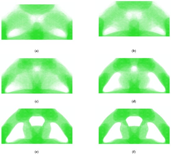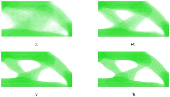 Topological evolution of the MBB beam (). (a) Substep 1; (b) Substep 5; (c) Substep 10; (d) Substep 15; (e) Substep 20; (f) Substep 27.