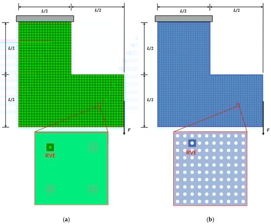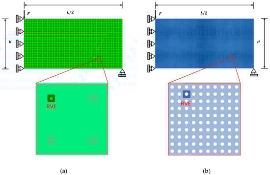 Traditional FE2 is very time-consuming because it requires iterative solution. At the same time, programming of the model’s constitutive law is also required. Tan [17] proposed an improved Direct FE2 model based on the FE2 method, which uses multi-point constraints (MPCs) to establish equations between microscale RVEs and macroscale elements. It makes the internal virtual work for microscale FE analysis equal to that of macroscale FE analysis by scaling the sizes of RVEs at Gaussian integration points [18]. Direct FE2 eliminates the two-layer nesting problem of the traditional FE2 method and greatly reduces the data transfer cost, computational cost, and memory cost. In addition, the method can be directly performed on existing mature commercial FE codes (e.g., ABAQUS) without extensive programming knowledge and constitutive modeling expertise, which facilitates the use of FE2 and expands its application [19]. The method also has good applications in geometric nonlinear and material nonlinear models [20,21,22].