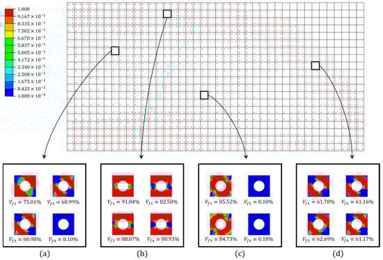 The contour plot of densities after optimization is shown in Figure 20. To better show the results, only the elements with the top of the density are drawn in the whole model picture. Four typical macroscale elements are zoomed in and plotted at the bottom of the whole model picture. The , , , and in the figure represent the retained volume fraction of each RVE.