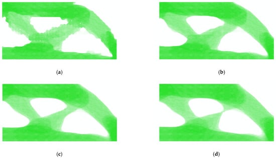 The contour plot of densities after optimization of the bridge-type structure. Only the elements with the top of the density are drawn in the whole model picture. (a–d) are magnified views of the local regions of four typical macroscale elements. , , , and represent the retained volume fraction of four RVEs in the macroscale element (not drawn to scale).