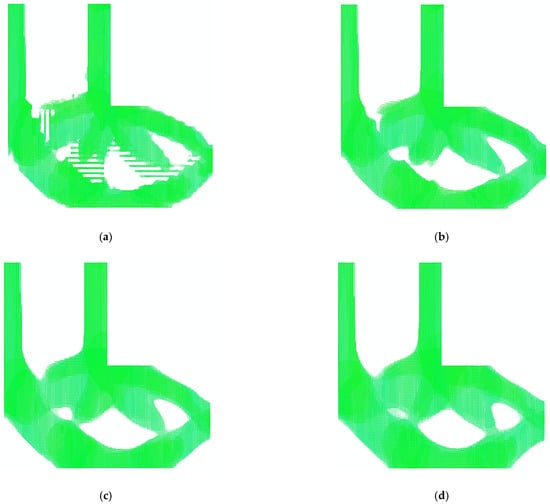Four representative filter radiuses, are considered to illustrate the choice of filter radius: see Figure 24. The “gap” problem occurs when the filter radius is too small. A filter radius between and is recommended for the loaded knee model. The topological evolution of the Direct FE2 model with filter radius is shown in Figure 25.