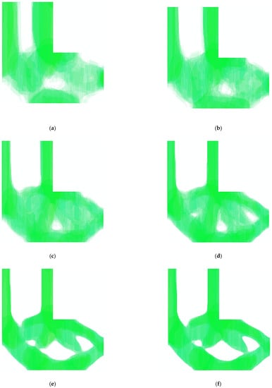 Topological evolution of the loaded knee model (). (a) Substep 1; (b) Substep 5; (c) Substep 10; (d) Substep 15; (e) Substep 20; (f) Substep 26.