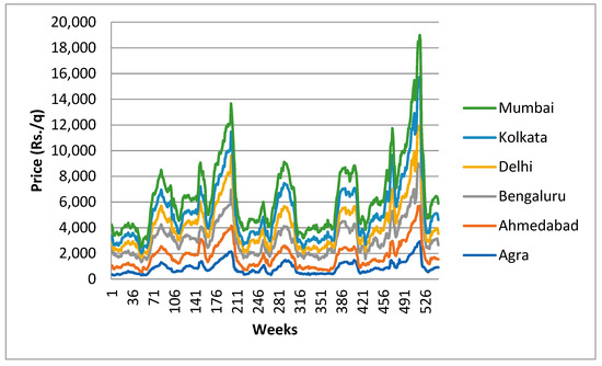 Table 1 provides the descriptive statistics for the selected price series. Each series comprises 548 (weeks) observations. Bengaluru exhibits the highest mean as well as median price, followed by Mumbai, Kolkata, Delhi, Ahmedabad, and Agra. However, for minimum and maximum prices, the same trend is not observed. Except for Bengaluru and Mumbai markets, other markets have a high coefficient of variation (C.V.) percentage for their price series. The price series of all the markets is positively skewed and leptokurtic.