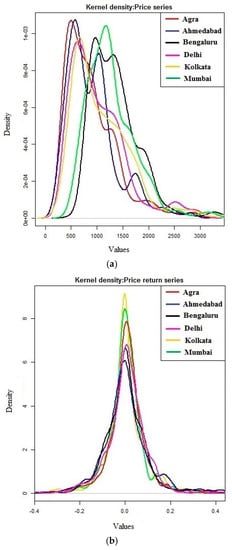 Any ARCH process’s innovation distribution depends on the available data. The Shapiro–Wilk test [34] was conducted to find out whether a series was normal. The null hypothesis for this test was that the underlying series is normally distributed. At a 1% level of significance, it can be observed that all of the price and price return series were out of the normality assumption (Table 2). The kernel density plot (Figure 2) can also be used to confirm that the price series, price return series, and square price return series were not normally distributed. The data series are thought to follow the t-distribution because of the excess kurtosis present. As a result, the innovation distribution is regarded as a t-distribution.