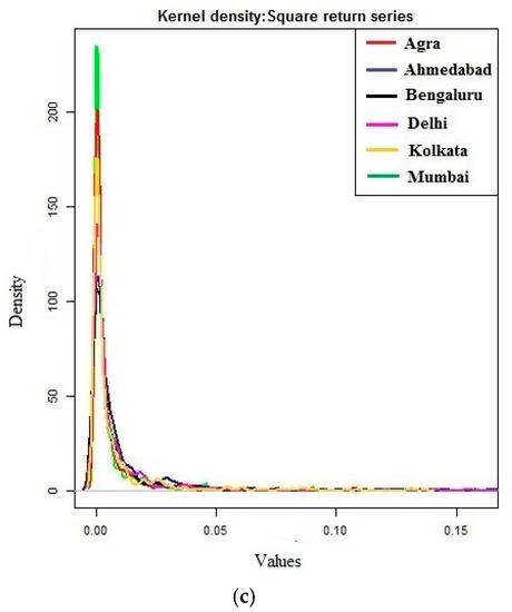 Kernel density plot for the (a) price series, (b) price return series, and (c) square return series.