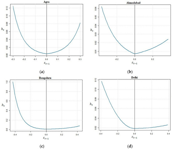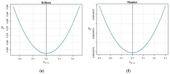 Price volatility can also be affected by the nature of new information introduced into the system. Du and Dong [31] studied how the volatility of price and trade volume is affected by new information in the US dairy futures markets. The News Impact Curve [32] is a qualitative measure of visualizing the past return shocks to current volatility. It emphasizes the inferred association between and. For calculating the NIC, all the available information up to epochs is considered constant, and the unconditional variance at its numerical level represents all lagged conditional variances. For a symmetric situation such as the GARCH model, the NIC is symmetric with the line of symmetry . For any asymmetric model, either the curve is asymmetric or the equation of the line of symmetry is .