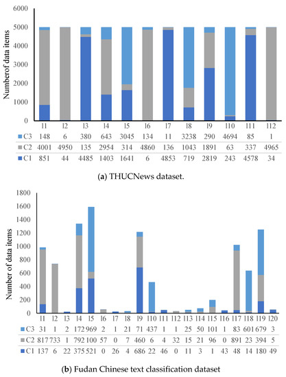 We use the THUCNews and Fudan Chinese text classification datasets as the experiment dataset. THUCNews selects 12 categories of news data, each of which contains 5000 training samples and 5000 test samples. The Fudan Chinese text classification dataset contains 20 categories, including 9936 training samples and 9802 test samples. In the federated learning environment, each participant attracts different interested users with different characteristics, resulting in a different distribution of data categories. Therefore, we need to conduct random sampling of the original data set with non-IID distributed data. This paper uses the Dirichlet distribution division method to divide each participant into non-IID distributed data sets with label offset, that is, to make each participant’s training data set with different label distributions. The non-IID distributed data of 3 participants are shown in Figure 2.