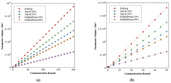 Parameter volume on different communication rounds. (a) is the result of the Fudan Chinese text classification dataset, and (b) is the result of the THUCNews dataset.