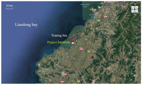 Taiping Bay Cooperation Innovation Zone is located in the north of Dalian on the Bohai Sea side of Liaodong Peninsula, 240 km from Shenyang in the north and 106 km from Dalian in the south. The port area is about 13.86 km2. The port was originally the sea area, and the existing land was composed of new dredger fill. The proposed site is located in the coastal, shoal zone. The location of the foundation treatment project is shown in Figure 1. The site is backfilled with granular soils at present, and the average backfill thickness is 7.5 m. The current situation of the proposed site is shown in Figure 2. In Figure 2, the western side of the proposed site is close to the coastline.