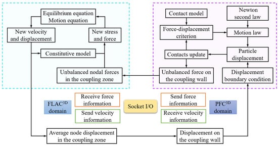 At each cycle of PFC3D, a force–displacement criterion is applied to each contact, controlling the motion of particles according to Newton’s second law, while constantly updating the position of the particles and the wall. The unbalance force on the coupling wall is transmitted to FLAC3D through the embedded Socket I/O interface. After obtaining the new stress and force, the new velocity and displacement are calculated by calling the equilibrium equation (motion equation), and the node displacement on the coupling area is transformed into a new displacement boundary condition through the Socket I/O interface. The displacement of particles in the discrete domain is made, and the cyclic calculation is carried out successively.