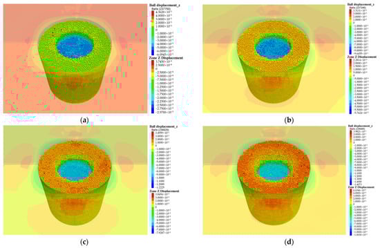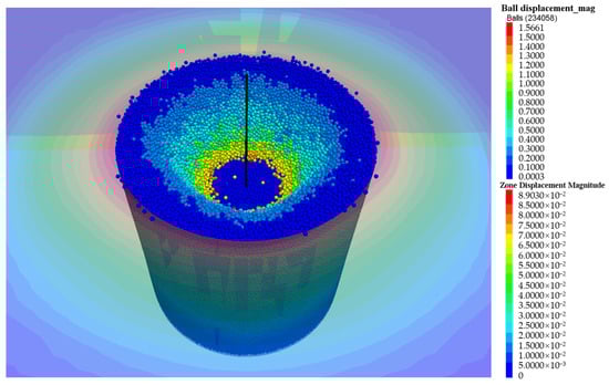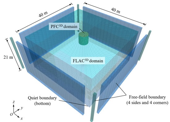 In the dynamic analysis of geotechnical engineering, the fixed boundary conditions commonly used in static analysis will cause a reflection of dynamic waves on the model boundary, and this phenomenon can be reduced by adopting a wider model range [37,38]. For this reason, a larger model size was used in this numerical simulation, with a length and width of 40 m and height of 21 m. Free field boundaries were set at the four sides and four corners of the model, and a quiet boundary was set at the bottom of the model, which could eliminate the reflection of dynamic waves at the model bottom and achieve an effect similar to an infinite range boundary. The granular soil in the central area with a height of 5 m and a diameter of 5 m was discretized and surrounded by continuum. The size radius of the soil particles was between 0.035 and 0.04 m. In the initial stage, 238,214 balls were generated in the discrete domain. The three-dimensional FDM–DEM coupling numerical model is shown in Figure 4.