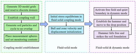 The outline of this paper is as follows: firstly, the soft soil foundation treatment project of Taiping Bay Cooperative Innovation Zone in Wafangdian City, Dalian City is taken as an engineering background. The foundation treatment scheme is determined on the basis of the geological conditions. Secondly, a three-dimensional continuum–discrete fluid–solid coupling dynamic analysis model is established using Particle Flow Code (PFC) and Fast Lagrangian Analysis of Continua (FLAC). The procedure of a hammer’s free fall from a given height to strike the ground is performed in clumps. The cumulative crater depth, the variation of soil void ratio, the changing process of vertical additional dynamic stress at different positions along the depth, and the pore water pressure after dynamic compaction were obtained. Lastly, the cone tip resistance before and after dynamic compaction at the center line of the crater was obtained by means of simulated static cone penetration tests (CPTs). Compared with field tests, the reliability of soil particle microparameters and the effectiveness of high-energy dynamic compaction in foundation treatment were verified.