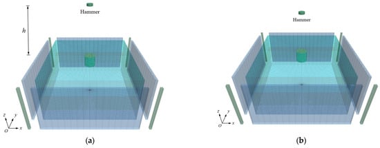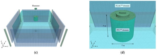 In numerical simulation methods, FEM can only analyze small deformation issues, because, once the displacement gets too large, the mesh of finite elements will be distorted, resulting in inaccuracy of calculation results or nonconvergence of the calculation process. A substantial displacement of soil occurs instantly when a hammer strikes the ground. Therefore, it is difficult to obtain accurate calculation results by using the finite element method to analyze the displacement and additional stress variations induced by high-energy dynamic compaction. The DEM can simulate the large deformation of soil particles, which has unique advantages in reflecting the micromechanical behavior of soil, especially for backfilled granular soil. However, the DEM decomposes the soil mass into a series of particles in space and carries out iterative calculation over time, which requires a huge amount of computation and is far less efficient than continuum methods. As a result, the DEM is limited in model size or can only simplify the three-dimensional problem into a two-dimensional problem analysis. The finite difference method (FDM) provides an approach to solve the large deformation problem in a continuum. However, the necessity for mesh precision is significant when dealing with the dynamic problem of local impact load, and it is still difficult to fully reflect the local punching characteristics around the hammer. With the continuous development of numerical analysis technology, continuum–discrete coupling calculation methods, such as FDM–DEM coupling, provide a new possibility to solve the dynamic problem of local large deformation [33,34,35,36].