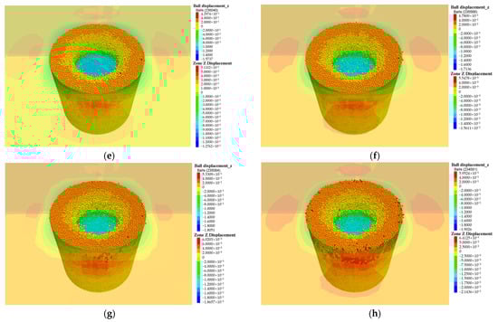 In order to verify the reinforcement effect of dynamic compaction on foundation soil, the PFC walls were used to establish a static cone penetration model. The cone tip angle was 60°, the diameter was 43.7 mm, and the penetration velocity was 1.2 m/min. The cone tip resistance qc along the depth direction was recorded during the penetration process. The simulated static cone penetration tests were carried out in the crater center before and after dynamic compaction. The penetration process of static cone penetration after dynamic compaction is shown in Figure 17. The comparison of simulated static cone penetration tests before and after dynamic compaction is shown in Figure 18.