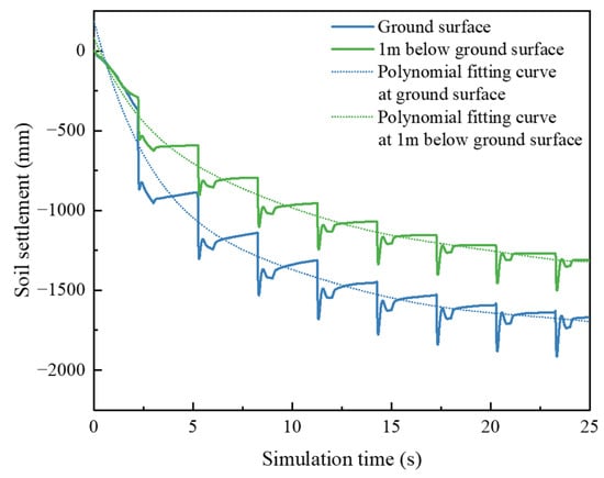 Figure 11 describes the relationship between crater depth and strike times. Initially, backfilled granular soil would produce a certain amount of settlement under gravity. The soil settlement caused by the first strike was the maximum due to the large soil void ratio before dynamic compaction. The instant rebound at the crater bottom after the first removal of the hammer was small. With the increase in strike times, the instant rebound at the moment when the hammer was removed increased gradually. However, with the increase in strike times, the resilience of soil stabilized after hammer removal first increased and then decreased gradually. The reason is that there were large voids in the soil at first, and the particles were not wedged tightly. The first strike changed the soil from loose to compact. As the soil was gradually compacted, the resilience of he foundation was enhanced. However, the enhancement of resilience indicates that the compaction degree did not reach the requirement of foundation treatment. When the number of strikes reached seven and eight, the soil settlement of a single strike was reduced, and the rebound in the process of soil stabilization after hammer removal was close to zero, demonstrating that the soil foundation reached a satisfying compaction state at this time. In practical engineering, the standard of hammer retraction is determined by the average settlement in the crater of the last two strikes. When the dynamic compaction energy E of each strike is between 8000 kN·m and 12,000 kN·m, the average settlement in the crater of the last two strikes should be less than 200 mm. According to Figure 11, the total crater depth was 1669 mm, the soil settlement at the crater surface in the first strike was 460.7 mm, and the soil settlement at the crater surface in the last strike was 28.8 mm, meeting the standard of hammer retraction. Polynomial fitting of the soil settlement curves revealed that the curvature of the fitting curve gradually decreased, indicating that the foundation’s bearing capacity increased progressively with the increase in strikes of dynamic compaction and eventually tended to a stable value.