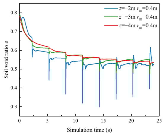 The soil void ratio e variations at different depths were monitored by placing measurement spheres in the discrete domain of the FDM–DEM coupled model. The principle of measurement spheres is to measure the volume of particles in the sphere domain and calculate the porosity. Then, the soil void ratio is obtained by the relationship between porosity and void ratio. The radius of the measurement sphere was 400 mm, and the centers of the sphere were distributed at −2 m, −3 m, and −4 m. The changing process of soil void ratio at different depths during dynamic compaction is shown in Figure 12.