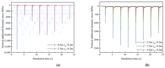Variation trends of the vertical additional dynamic stress at different depths: (a) range from −2.0 m to 0 m; (b) range from −5.0 m to −2.0 m.