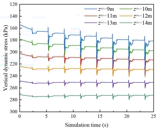 Meanwhile, the fluctuations of the vertical additional dynamic stress of soil in the discrete domain shown in Figure 13 were obvious, indicating that the discrete domain within 5 m below the ground surface was in the effective reinforcement range of dynamic compaction. In order to further study the maximum effective reinforcement depth that the dynamic compaction energy level of 8000 kN·m could achieve onsite, the variation trends of vertical dynamic stress at the distance between −14 m and −9 m from the ground surface in continuum are shown in Figure 14. The vertical dynamic stress in Figure 14 includes the initial self-weight stress.