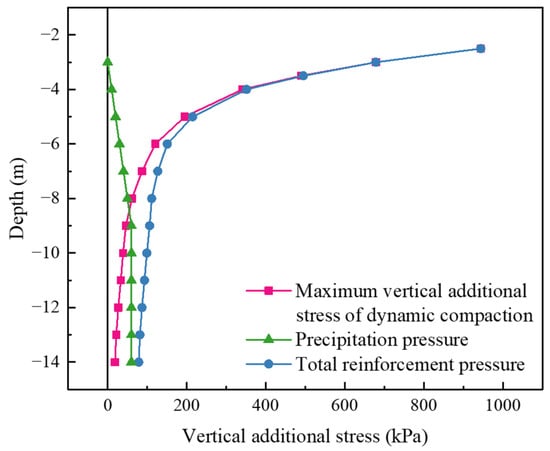 As can be seen from Figure 16, the dewatering preloading induced by groundwater descending from z = −3 m to z = −9 m was trapezoidal. The vertical additional dynamic stress induced by dynamic compaction decreased rapidly along the depth. The superposition of both could increase the reinforcement effect on deep soil, making up for the limited reinforcement effect of dynamic compaction on deep soil.