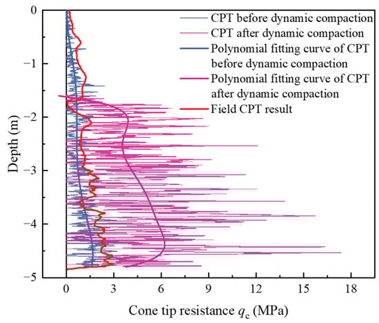 The simulated results of CPT before dynamic compaction had a good agreement with the field CPT results, verifying the reliability of the numerical calculation parameters. It should be pointed out that, due to the computational efficiency of discrete elements, it is difficult for the particle size to be completely consistent with the size of real soil particles; hence, the cone tip resistance would be zero intermittently in the process of simulating CPT. Therefore, the simulated CPT result was slightly lower than the field CPT result. It can be seen from the comparison results that the simulated results of CPT after dynamic compaction were about 3–5 times higher than those before dynamic compaction. The results illustrate that the modulus of foundation soil could be increased by about 3–5 times after eight strikes of 8000 kN·m high-energy-level dynamic compaction.