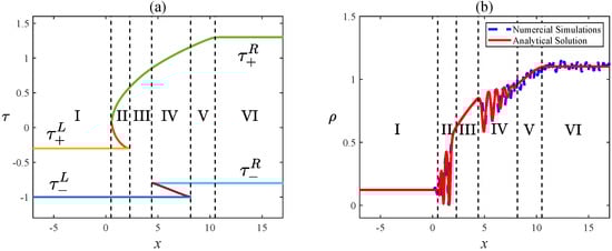 where , , and are constants. Choosing , , and , the distributions of Riemann variables and the structures of density function are shown in Figure 1. Here, we have used a 1-genus Whitham Equation (37). The fundamental wave structures of rarefaction wave (RW) and DSW, along with the relevant mathematical theory, are presented in Ref. []. In this case, the Riemann invariants are divided into six regions, which, from left to right, are plateau, DSW, RW, DSW, RW and plateau. We now give the solutions for each region and the boundary velocities.