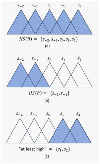 - Extended HFLTS (EHFLTS): this makes it possible to create sets of non-consecutive ordered terms based on a combination of HFTLSs given by a group of DMs. As indicated in Equation (1) (Table 1), represents the set of all possible linguistic terms that express the preferences of the DMs, and indicates each of the linguistic terms chosen by them [15]. An EHFLTS can be especially useful in situations in which the DMs are divided into subgroups and there is no consensus among the DMs, which therefore leads to the need to represent evaluations in non-consecutive terms [44];