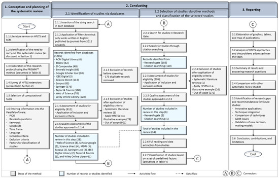 Finally, a limitation of this study was that there may be works that present HFLTS or HFLTS extension applications that were not identified in our searches. Even though we consulted various databases, this list was not exhaustive. In addition, we opted to include only articles in English and did not include gray literature or non-realistic numerical applications. Future studies can complement the results of this systematic review of the literature by including new works in the study sample. Other reviews can also be conducted that consider applications of techniques derived from HFSs and HFS extensions in various areas of knowledge such as the engineering, health, construction, and energy fields.