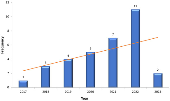 This section is dedicated to answering the research questions RQ1.1 to RQ1.4 and presenting the classification results for these studies in terms of year of publication, journal, country, and most cited articles. Figure 3 presents the distribution of the number of articles by year of publication (RQ1.1). This figure demonstrates that our subject is quite emergent in the literature, given that the first publication we found occurred in 2017. Roughly 58.8% of the studies were published within the past three years (beginning with 2021). In addition, the trend line of Figure 3 indicates a growth trend in terms of the number of publications about this subject. It is important to mention that the results displayed in the last column of the graph only include studies published in the first few months of 2023, given that our study sample was selected in March 2023.