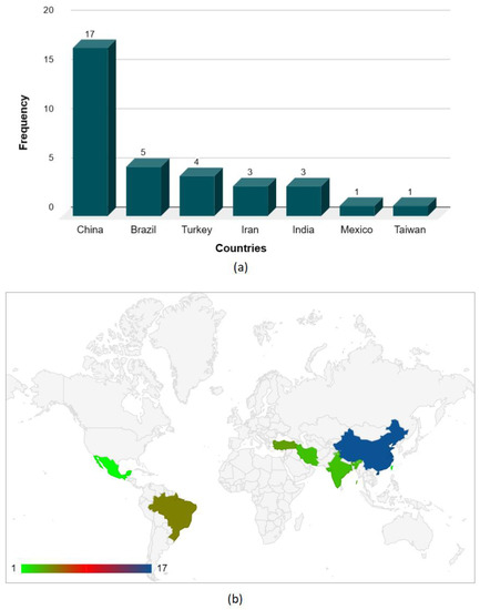 Figure 4a presents the distribution of publications classified according to the country of the first author’s affiliated institution for each study (RQ1.2). China had the largest number of publications with 17 studies, which represented 50% of our analyzed sample. It was followed by Brazil (five studies), Turkey (four studies), India (three studies), and Iran (three studies). As shown in Figure 4b, production related to this subject was concentrated in Asia (24 studies), South America (5 studies), and Europe (4 studies).