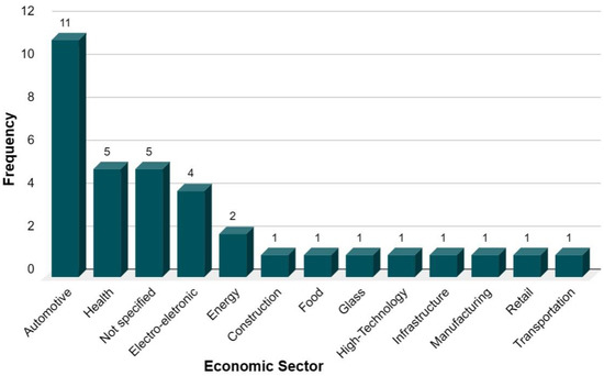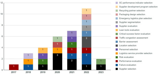 To answer the research questions RQ2.1 to RQ2.4, this section presents the results regarding the objectives of HFLTS applications in SCM processes, their industrial sector, and the company’s type of SCM strategy. In order to identify the most common decision-making problems in SCM that have been addressed using HFLTSs and HFLTS extensions, the selected studies were classified based on the application objective. Based on this, to elucidate which SCM processes received the greatest attention in these applications, each study was classified as dealing with one of the following SCM processes: Source, Plan, Make, Deliver, Return, and Enable. These are the six main SCM processes according to the Supply Chain Operations Reference (SCOR) model, which is an SCM reference that has been widely adopted by practitioners and researchers [48]. Table 7 displays the results of the classification of our studies in terms of the objectives of their applications and the associated SCM processes (RQ2.1). Studies dealing with supplier selection were the most frequent, totaling 23.5% of the sample. They were followed by failure evaluations (11.8%) and performance evaluations (8.8%). Figure 5 exhibits the frequency of application objectives over the years. This figure indicates the dominant relevance of the supplier selection problem over the years.