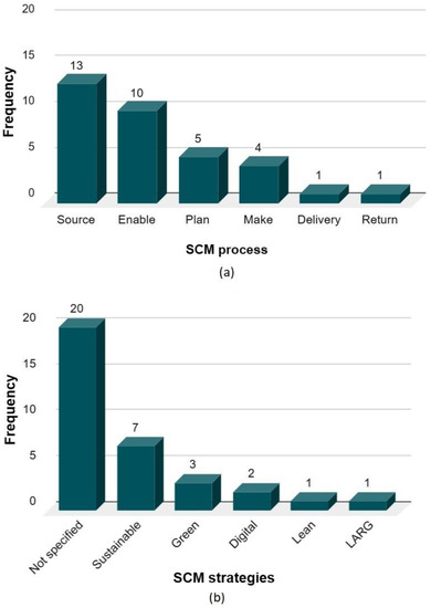 According to the results displayed in Figure 6a, the Source process had the most associated applications and represented 38.2% of the studies. This process is dedicated to acquiring goods and hiring external services that are necessary to meet actual or planned demand. It was followed by the Enable process with 29.4% of the studies. The high frequency of applications related to the Source process seemed to be related to the fact that this process requires decision-making processes that affect several areas of the business. The main one is supplier selection, which determines part of the supply chain structure and also influences production costs, product quality, and customer satisfaction. Similarly, the Enable process encompasses other decision-making processes that are essential for supply chain structuring and operation, such as personnel selection, location selection, performance evaluation, and risk assessment [48].