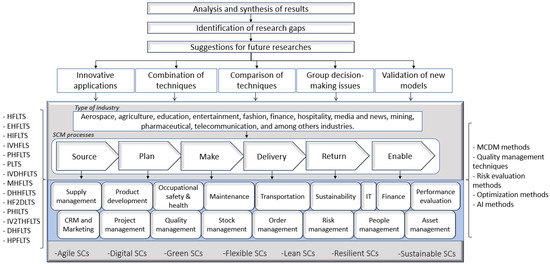 - It is important to investigate issues regarding SCM decision-making processes and methods; for example, the types of decision-making problems in which HFLTS techniques are applied, the most often used techniques, and the way the application results are validated. Furthermore, since the use of criteria weights influences the results of the decision-making problem, it is important to analyze how criteria weighting has been addressed in HFLTS applications and its extensions in SCM;