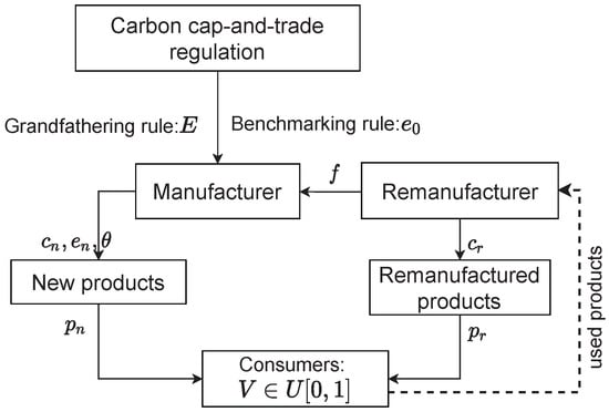 Under the grandfathering rule, the manufacturer’s carbon free emission allowance allocation is E. Under the benchmarking rule, the carbon emission allowance allocation is based on the benchmark emission of the industry times the quantity of new products. If the realized carbon emissions generated by production exceeds the free emission allowance, the OEM must buy the lacking carbon emission permits in a carbon trading market. If the realized carbon emissions generated by production falls below the free emission allowance, the OEM can obtain extra profit by selling any surplus quota on the carbon trading market. The initial carbon emission per new product and per remanufactured product without emission reduction investment are denoted as and , respectively. The carbon trading price is denoted by . We assume that the carbon purchasing price is equal to the selling price. The OEM invests in low-carbon technology to increase demand. Similar to the cases in much related research [36,37,38], the carbon emission reduction investment in sustainable technology is , which can be measured as the level of investment in emission reduction technology . The value is the cost coefficient of emission reduction, which is determined by industrial characteristics and investments in technological research and development. Without loss of generality, we assume that is greater than in combination with the industrial reality. Due to the implementation of emission reduction technology, the carbon emission per unit new product decreases to . As the cost of reduction in carbon emissions is positively correlated with the level of investment in emission reduction technology, a greater level of emission reduction is not for the better of the OEM. The OEM makes decisions on the optimal pricing and emission reduction investment to maximize total profit.