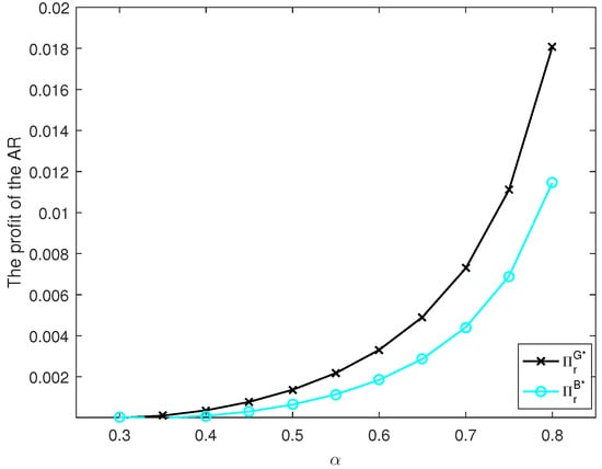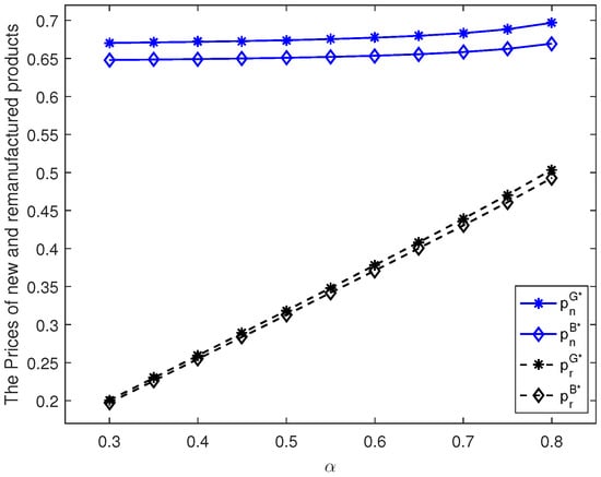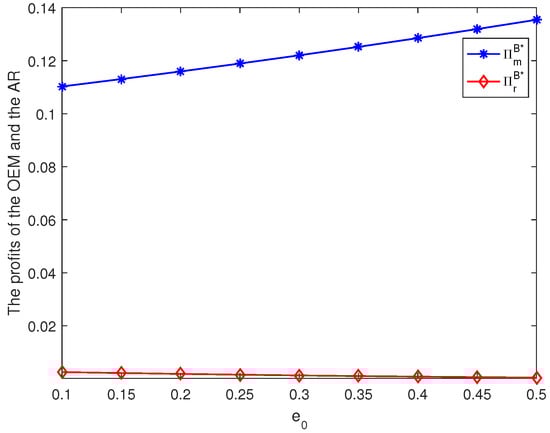 Figure 2 reveals that the optimal prices of new and remanufactured products under the grandfathering rules are higher than under the benchmarking rule, which is consistent with Corollary 5. Meanwhile, they both increase as consumer preference for the remanufactured product () increases. Combined with Figure 2, Figure 3 indicates that the OEM would raise the price appropriately to mitigate the loss caused by a decrease in sales, while the remanufacturer would raise the price to increase the profit due to the consumers favoring remanufactured products.