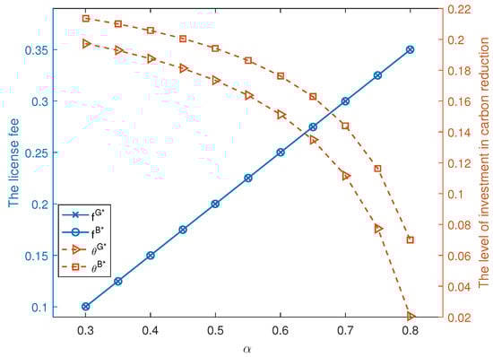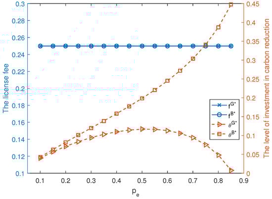 Since holds, then . So, we obtain the optimal pricing, the level of investment in carbon reduction technology, the license fee, and profits of the OEM Using software mathematics, as shown in Proposition 2. □