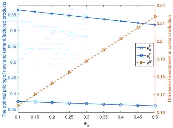 Through numerical analysis, this section explores the variational trend of product pricing, the level of investment in emission reduction, demand and profit of the two types of products, with consumer preference for the remanufactured product (), as well as the impact of consumer preference for the remanufactured product () on total carbon emissions. Specifically, the parameters are set to the following values: .