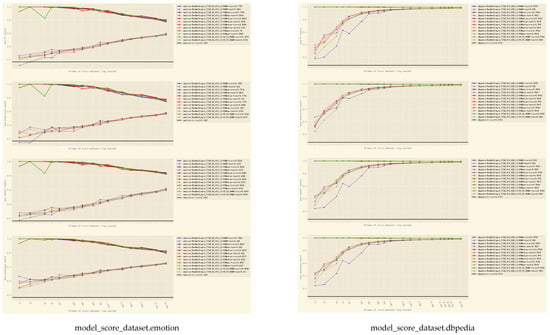 F1-score, accuracy, precision, and recall of the emotion and dbpedia datasets.
