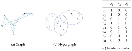 The hypergraph G = ( V , E ) takes into account the high-order relationships among multiple vertices and consists of a non-empty vertex set V = { v 1 , v 2 , , v n } and a non-empty hypergraph set E = { e 1 , e 2 , , e m } . Each element v i V is called a vertex, and each element e j E is a subset of V, which is known as a hyperedge of G. G is a hypergraph defined on V if e j for j = 1 , 2 , , m and e 1 e 2 e m = V .