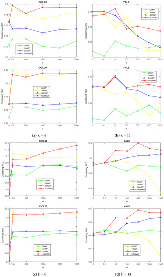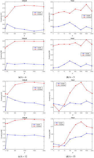 First, we give the construction of the hypergraph regularization term. Given a nonnegative data matrix X = [ x 1 , x 2 , , x n ] R + m × n , we expect that, if two data samples x i and x j are close, the corresponding encoding vectors c i and c j in the low-dimensional space are also close to each other. We encode geometrical information in the coefficient matrix hypergraph by linking each data sample with its k nearest neighbors and denoting their hypergraph connections with heat kernel weight: