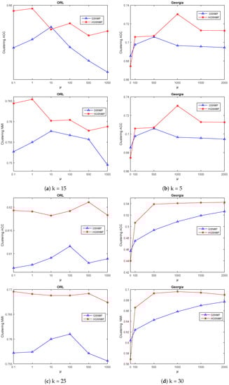 NMF has been gaining popularity through the works of Lee and Seung that were published in Nature [13] and NIPS [14]. It has been widely applied in clustering [20,21,22], face recognition [23,24], text mining [25,26], image processing [27,28,29], hyperspectral unmixing (HU) [30,31], and other fields [32,33,34,35]. Several NMF versions have been presented in order to improve data representation capabilities by introducing different regularization terms or constraint terms into the basis NMF model. For example, by considering the orthogonality of factor matrices, Ding et al. [21] presented a orthogonal nonnegative matrix tri-factorization (ONMF) approach. By incorporating the graph regularization term into the standard NMF model, Cai et al. [2] presented a graph-regularized nonnegative matrix factorization (GNMF) method, where a simple nearest neighborhood graph is constructed by considering the pairwise geometric relationships between two sample points. However, the model did not take into account the high-order relationships among multiple sample points. Shang et al. [36] presented a graph dual regularization nonnegative matrix factorization (DNMF) approach, which simultaneously considers the intrinsic geometry matrix structures of both the data manifold and the feature manifold. However, their DNMF approach neglects the high-order relationships among multiple sample points or multiple features. To solve the above problem, Zeng et al. [37] presented the hypergraph-regularized nonnegative matrix factorization (HNMF) method, which incorporates the hypergraph regularization term into NMF and constructs a hypergraph by considering high-order relationships among multiple sample points. However, HNMF is unable to produce a smooth and precise solution, because it does not take into account the smoothness of the basis matrix. Recently, Leng et al. [38] proposed the graph-regularized L p smooth nonnegative matrix factorization (GSNMF) method by incorporating the graph regularization term and the L p smoothing term into the basis NMF model, which considers the intrinsic geometric structures of the sample data and may produce a smooth and more accurate solution to the optimization problem with the addition of the graph regularization term and the L p smoothing constraint. However, in GSNMF, only the pairwise relationships between two sample points are considered, and the high-order relationships among multiple sample points are ignored.