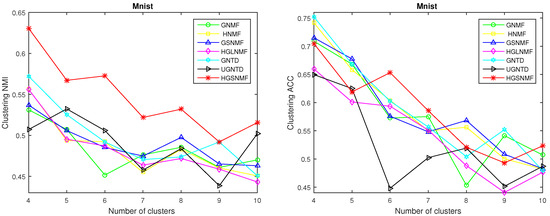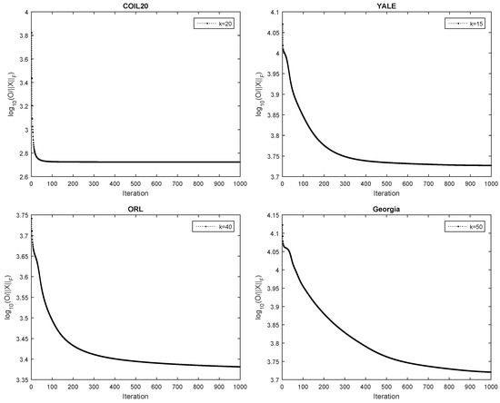 Data representation plays an important role in information retrieval [1], computer vision [2], pattern recognition [3], and other applied fields [4,5]. There are many approaches to deal with high-dimensional data, such as data dimensionality reduction, random forests (RF) [6], multilayer perceptrons (MPL) [7], graph neural networks (GNN) [8], and hypergraph neural networks (HGNN) [9]. The dimensions of data matrices are extremely high in these practical applications. The high-dimensional data can not only cause storage difficulties, but also possible dimensional curses. Therefore, it is necessary to find an effective and low-dimensional representation of the original high-dimensional data matrix. It is also important to preserve the multidimensional structure of the image data and to preserve the multidimensional structure of the image data. Matrix factorization is one of the important data representation techniques, and typical matrix decomposition methods mainly include the following: principal component analysis (PCA) [10], linear discriminant analysis (LDA) [11], singular value decomposition (SVD) [12], nonnegative matrix factorization (NMF) [13,14], and so on. The tensor of a multidimensional array is well suited to representing such an image space, and, in order to extract valuable information from a given large tensor, a low-rank Tucker decomposition (TD) [15] is usually considered. In the real world, many data images, video volumes, and test data are non-negative, and, for these types of data, nonnegative Tucker decomposition (NTD) has recently received attention [16,17,18,19].