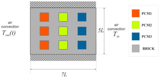 A two-dimensional problem of heat and mass transfer in a rectangular brick block, containing several inserts filled with materials with different melting temperatures, is considered (see Figure 1). The horizontal walls of the block are thermally insulated. On the vertical boundaries of the region, the condition of air convection with constant heat-transfer coefficients, γout at the outdoor surface and γin at the indoor surface, is considered. The temperature of the medium on the left side, Tout, varies according to the harmonic law, whereas the temperature of the medium on the right side is constant, Tin. The following assumptions and constraints have also been adopted: