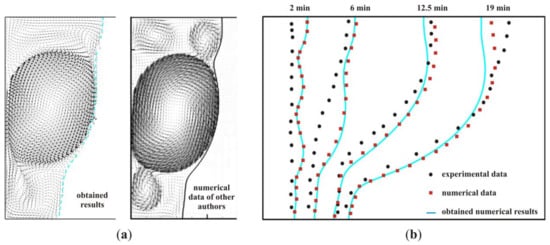 As a test problem, numerical simulation of the melting of gallium inside a rectangular region, heated by an isothermal side wall, has been carried out. The benchmark has been developed by Gau and Viskanta [39]. Figure 2a shows a comparison of the velocity field with the numerical data [40], and Figure 2b compares the position of the melting front with the experimental data [39] and the numerical results obtained by Kumar et al. [41]. The experimental cavity has dimensions 8.89 cm in height, 6.35 cm in width, and 3.81 cm in depth; considering the low value of the Prandtl number, the influence of the flow structure is significant, therefore, the effect of friction on the side walls of the parallelepiped in the three-dimensional model appears on the movement of the melting front. As for the comparison with the numerical results of two-dimensional modeling, the solution obtained using the proposed algorithm is in good agreement with the solutions on the moving grid [40] and the fixed grid [41].