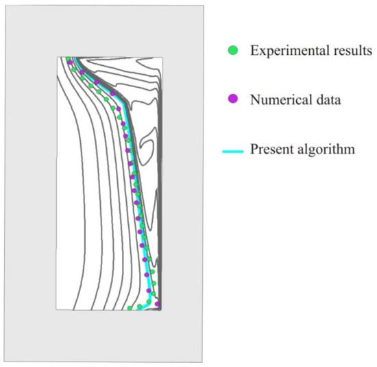 The algorithm has been also validated using the problem of lauric acid melting in a cavity heated by an aluminum slab. In an experimental study [42], the influence of the heat-sink inclination angle on the convective-melting regimes has been studied. Figure 3 shows a comparison of the results of the experiment [42], numerical data [43] and the present numerical solution for the phase-change line location with an inclination angle of π/2 at time of t = 50 min. The maximum deviation of the interfaces is observed in the upper part of the cavity, where the heated melt accumulates. At the top wall for y = 12 cm, the absolute error along the X axis is 3.5 mm or 8%, while in the half-height of the cavity, y = 6 cm, the absolute and relative errors are 0.18 mm and 2%, respectively. In the numerical study [43], the heat-conducting walls have not been taken into account, so the melting process at the bottom is very slow. Considering the friction and heat conduction from the side transparent walls in the experiment, the obtained isotherms are in good agreement with the experimental data.