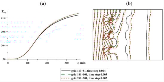 To obtain the most accurate results, the most optimal grid has been determined in terms of the accuracy of the results and the time spent on calculations. Solutions for the multi-PCM case for L = 0.01 m, for three different grids with different time steps and parameters η, have been obtained. An important point in a grid choosing is the fact that a decrease in the spatial step requires a decrease in the time step. In this regard, the use of detailed grids significantly increases the time spent on modeling processes. So, the solution of the problem on the grid of 113 × 81 elements up to the time of t = 6 h was completed in almost 14 h; for the grid of 141 × 101 elements, the calculation time is more than 55 h; and for the grid of 281 × 201 elements, the time of 234 h was already spent, that is, almost 10 days. The influence of the grid parameters and the time step on the average temperature of the right boundary and the temperature distribution at the time of t = 6 h, is shown in Figure 4. At the time of t = 6 h, the maximum difference between the graphs is 0.046 degrees, while between the graphs obtained on the grids of 141 × 101 elements and 281 × 201 elements, the difference is 0.0001 degrees (see Figure 4a). The isotherms obtained using these grids are coincided practically. All further calculations were carried out using the grid of 141 × 101 and 211 × 151 elements.