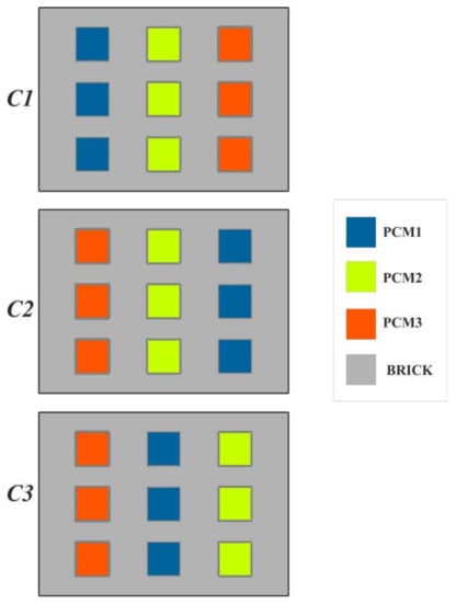 Since the phase-change materials have low thermal conductivity coefficients, lower than those of bricks, even in the absence of phase transitions, PCMs improve its thermal insulation qualities. Table 1 presents the thermophysical properties of all components of the considered domain. The brick block size was considered equal to 7 cm × 5 cm and 14 cm × 10 cm. The temperature difference varies from 10 degrees to 25 degrees Celsius. Different melting temperatures of materials also make it possible to evaluate the influence of the relative arrangement of materials in the system, since the sequence of melting significantly determines the distribution of heat in the volume. Figure 5 shows the main block configurations determined by the distribution of materials relative to indoor and outdoor, and are labeled as C1, C2 and C3. In addition to these models, the results for single-PCM bricks were also shown for comparative analysis.