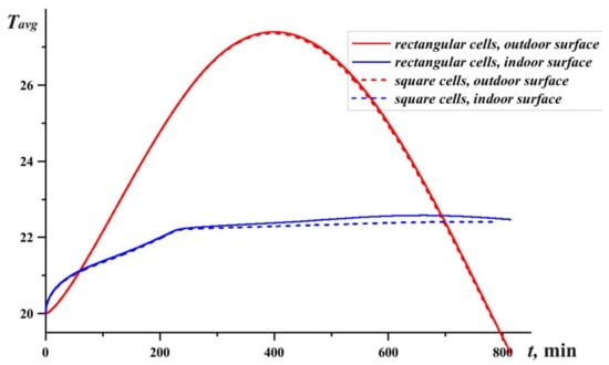 First of all, it is worth evaluating the effect of natural convection on the process of heat transfer in the system. Figure 6 shows a comparison of plots for average temperatures at the lateral boundaries in the case of vertical PCM cells and evenly spaced square cavities. In the case of square cells, the surface area of the containers increases and the process of heat transfer between paraffin and brick is intensified. Thus, a slightly lower temperature is observed at the right-indoor boundary than in the case of high cavities.